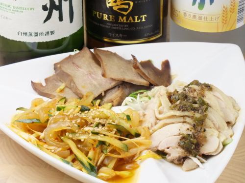 アサリの老酒漬け/チヤーシュ―冷製/蒸し鶏椒麻ソース/イカゲソ唐揚げ/蒸し鶏ネギソース